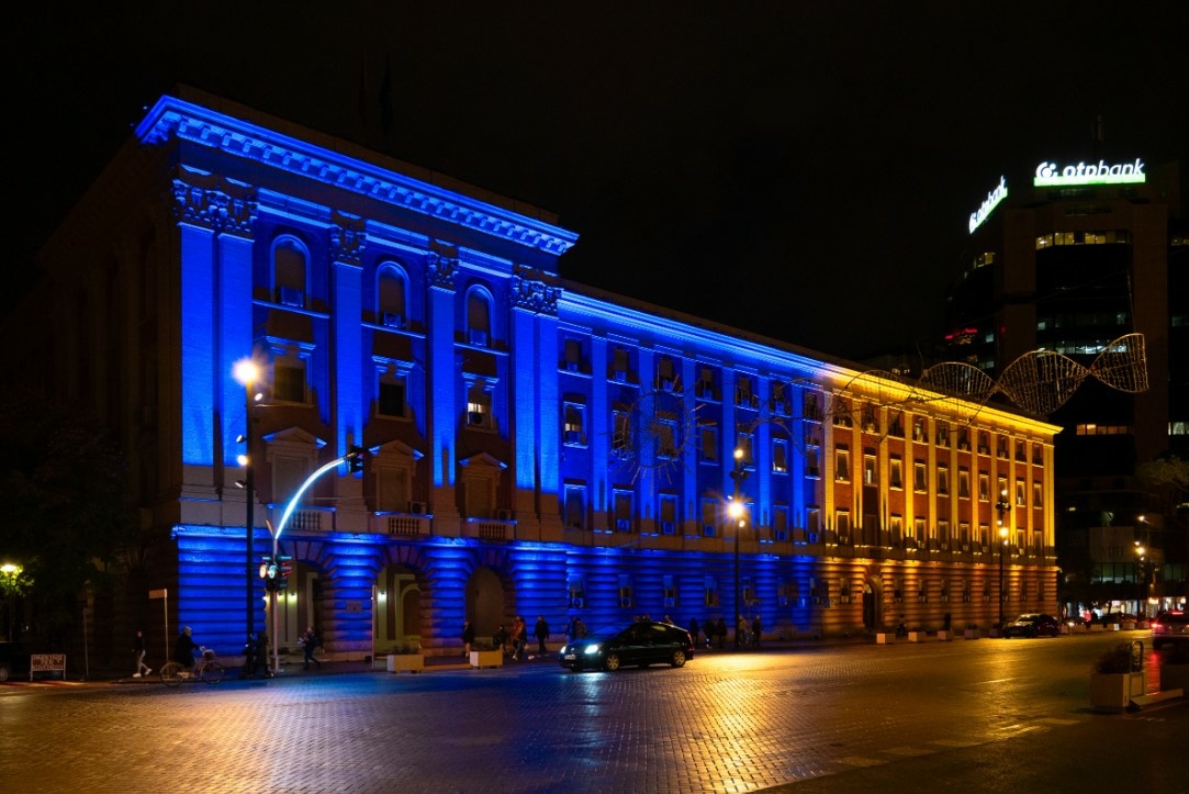 E me këtë rast, ndërtesa e Kryesisë së Kuvendit të Shqipërisë ndriçohet me ngjyrat e flamurit të Ukrainës