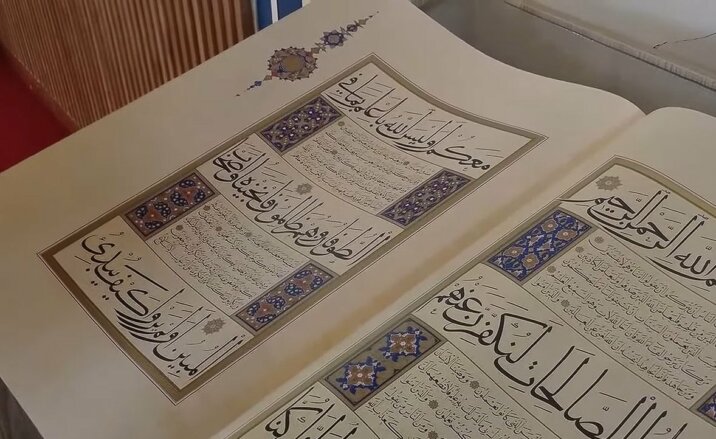 “Suret janë të zbukuruara. Sipas studiuesve që e kanë parë, se ne dimë pak, është lëkurë, peshon 17 kg, është i veçantë, thuhet se janë prodhuar tre të tillë. Kaligrafia është diçka më e bukur, e larmishme, ka ngjyra zbukurime. Kuranët e tjerë s’i kanë këto”, thotë Imami i kësaj xhamie, Kasem Hafizi, raporton abcnews.