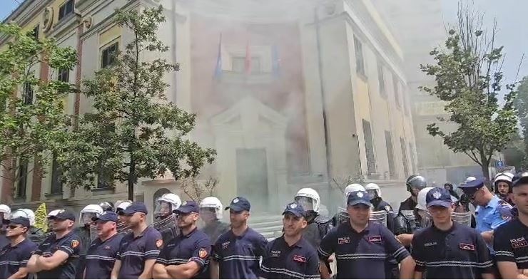 Një numer i lartë forcave të policisë rrethuan zonën për mbarëvajtjen e protestës, duke vendosur dhe një gardh metalik që ndante efektivët nga qytetarët.
