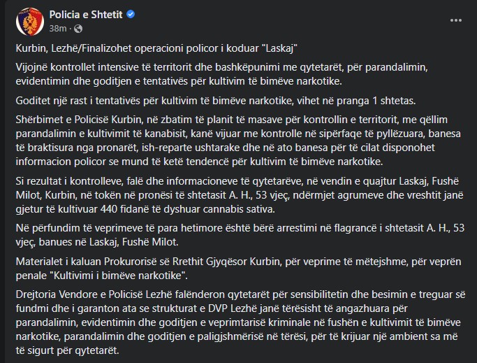 Shërbimet e Policisë Kurbin, në zbatim të planit të masave për kontrollin e territorit, me qëllim parandalimin e kultivimit të kanabisit, vijon me kontrolle në sipërfaqe të pyllëzuara, banesa të braktisura nga pronarët, ish-reparte ushtarake dhe në ato banesa për të cilat disponohet informacion policor se mund të ketë tendencë për kultivim të bimëve narkotike./arbresh.info/