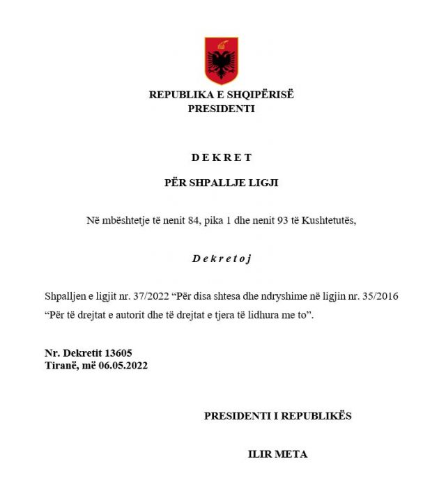 “Presidenti i Republikës, Sh.T.Z. Ilir Meta ka dekretuar me shpallje ligjin nr. 37/2022 “Për disa shtesa dhe ndryshime në ligjin nr. 35/2016 “Për të drejtat e autorit dhe të drejtat e tjera të lidhura me to”. Çdo nismë që synon përafrimin e direktivave të Bashkimit Europian, rritjen e disponueshmërisë së librave dhe materialeve të tjera të printuara në formate të përshtatshme e të aksesueshme për personat me aftësi të kufizuara, dhe forcimin e mbrojtjes së të drejtës së autorit, është e mirëpritur“, njofton presidenca./abc.al/