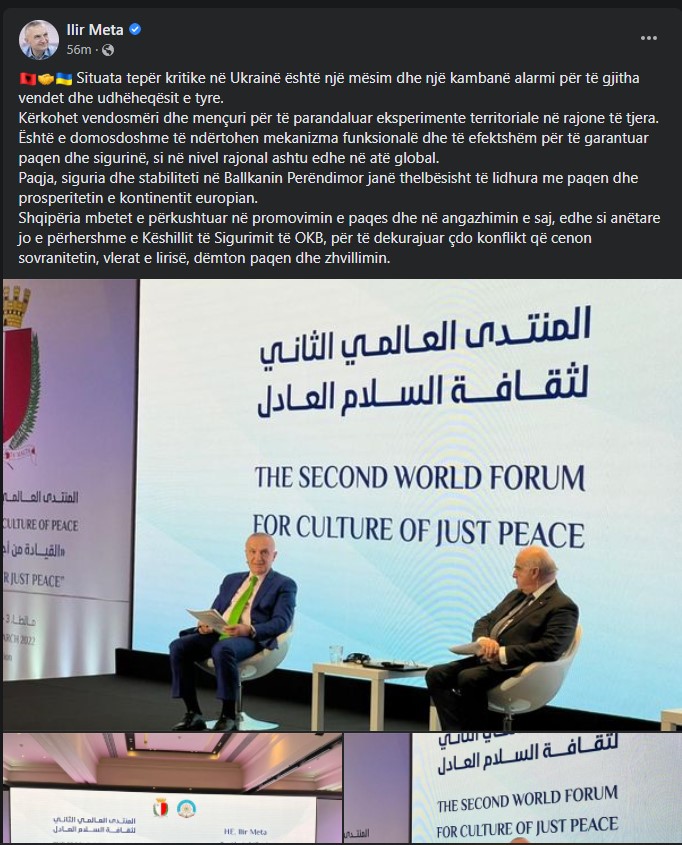 Presidenti i Shqipërisë, Ilir Meta ka njoftuar sot se po merr pjesë në punimet e “Forumit Botëror për Kulturën dhe Një Paqe të Drejtë” që po zhvillohet në kryeqytetin e Maltës në Valletta, nën kujdesin e Presidentit të Maltës, George Vella.