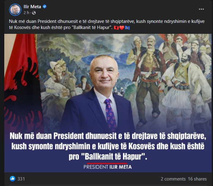 “Nuk më duan President dhunuesit e të drejtave të shqiptarëve, kush synonte ndryshimin e kufijve të Kosovës dhe kush është pro “Ballkanit të Hapur””, ka shkruar ai në llogarinë e tij në Facebook.