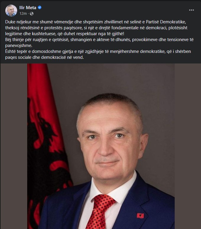 Presidenti i Shqipërisë, Ilir Meta ka reaguar sot në kohën kur po mbahet protestë para selisë së Partisë Demokratike, të thirrur nga ish kryeministri Sali Berisha.