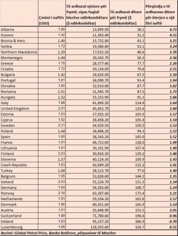 Shqipëria ka pothuajse të njëjtin çmim nafte si në Gjermani (rreth 1.8 dollarë për litër), por një qytetari gjerman i duhen vetëm 1.24% e të ardhurave ditore për të blerë një litër karburant. Në Danimarkë, ku nafta kushton 1.9 euro/litër, u duhen vetëm 1.1% e të ardhurave ditore.