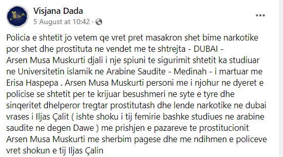 Madje në njërin prej tyre Hamza Muskurti akuzohej edhe për shfrytëzim prostitucioni, trafik droge dhe vrasjen e ish-shokut të tij Iliaz Çali. “Arsen Musa Muskurti personi me i njohur ne dyeret e policise se shtetit per te krijuar besushmeri ne syte e tyre dhe sinqeritet dhelperor tregtar prostitutash dhe lende narkotike ne dubai vrases i Iljas Çalit ( ishte shoku i tij femirie bashke studiues ne arabine saudite ne degen Daëe ) me prishjen e pazareve te prostitucionit Arsen Musa Muskurti me sherbim pagese dhe me ndihmen e policeve vret shokun e tij Iljas Çalin” thuhet në statusin e datës 5 Gusht.