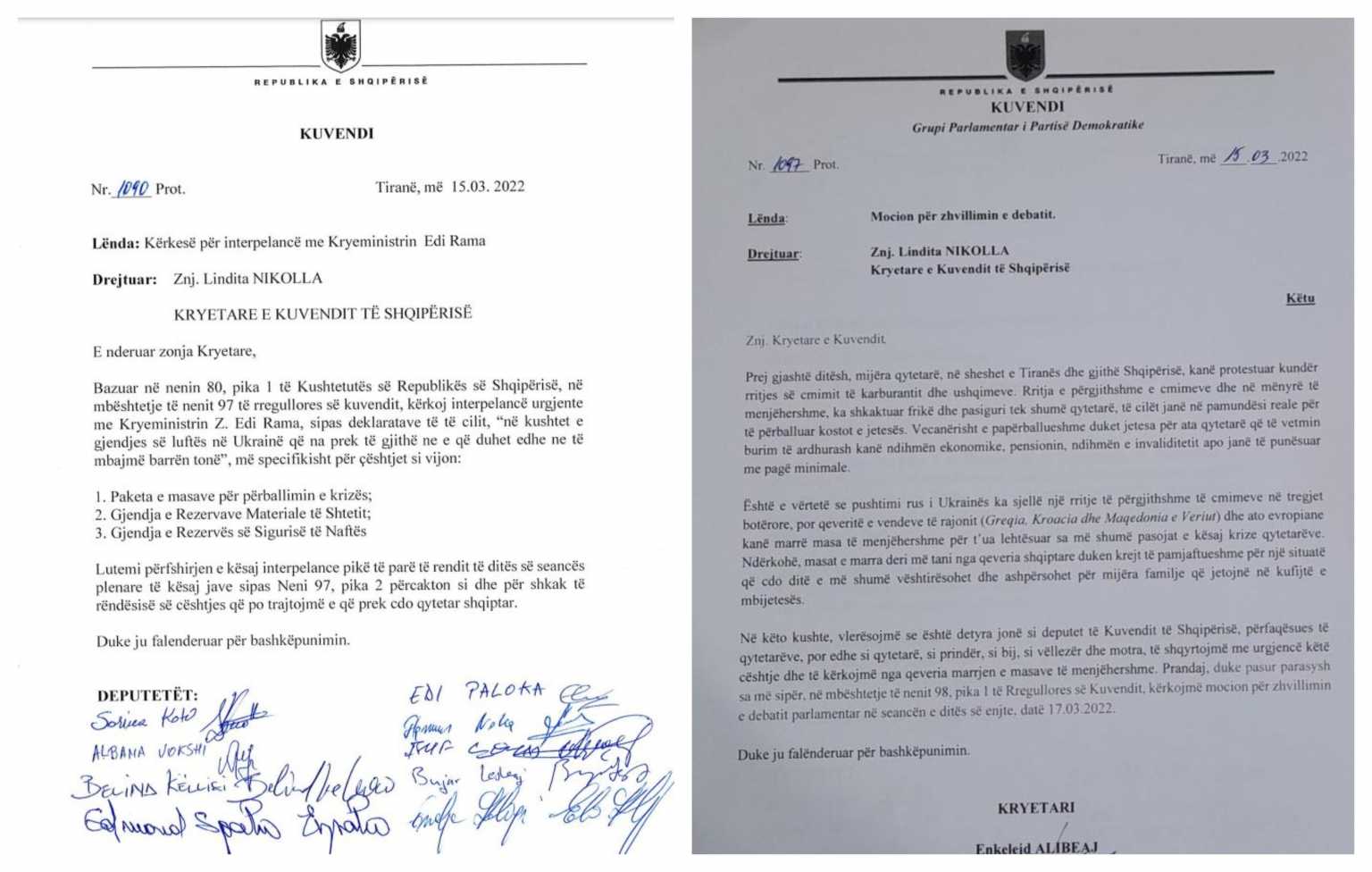 Kërkesa është firmosur nga Edi Paloka, Flamur Noka, Belind Këlliçi dhe 6 deputetë të tjerë dhe kërkohet të diskutohet mbi paketën e masave, rezervat e shtetit dhe rezervat e naftës në veçanti.