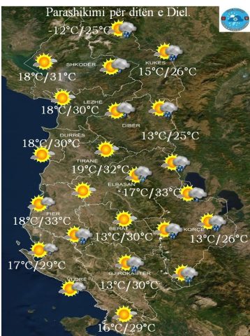 Edhe për ditën e Diel vendi ynë do të ndikohet nga relativisht të njejta kushte atmosferike. Moti parashikohet fillimisht me kthjellime e alternime vranësirash kalimtare. Duke filluar nga orët e mesditës shtim vranësirash mesatare dhe hera-herës deri të dendura.