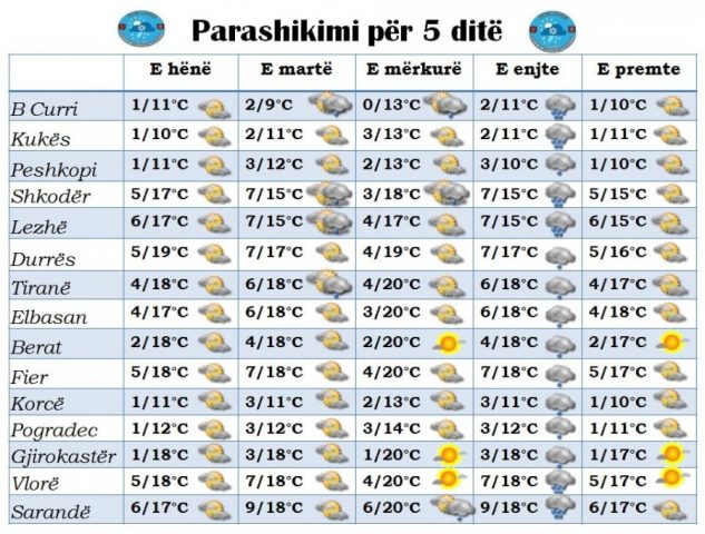 Vendi po përjeton ditë të kthjellta dhe të ngrohta në mesditë. Këto masa të qëndrueshme do të vijojnë qarkullimin e tyre në vend deri në mesjavë edhe pse në veri do të shfaqen reshjet e dobta të shiut. Ky qarkullim do të sjellë temperatura si në grafikun e mëposhtëm.