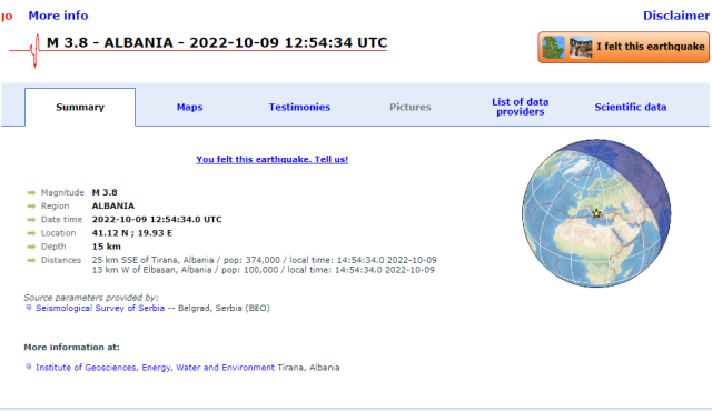 Magnituda e tërmeti ka qenë 3.8 e shkallës Rihter, ndërsa raportohet se lëkundjet janë ndjerë edhe në Tiranë.