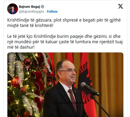 “Krishtlindje të gëzuara, plot shpresë e begati për të gjithë miqtë tanë të krishterë! Le të jetë kjo Krishtlindje burim paqeje dhe gëzimi, si dhe një mundësi për të kaluar çaste të lumtura me njerëzit tuaj më të dashur”, shkroi Begaj.
