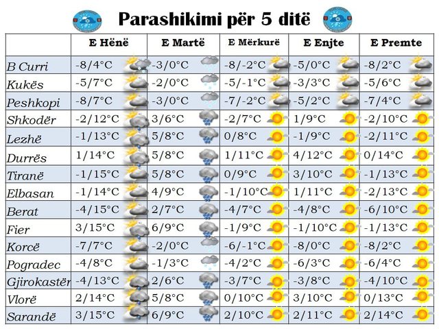 Java që presim përpara parashikohet një javë me mot kryesisht të qëndrueshëm por nuk do të mungojnë reshjet e shiut dhe të dëborës, përfshirë edhe temperaturat e ulëta.
