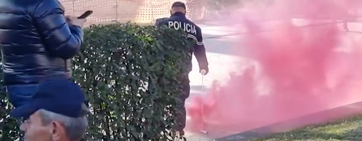Pas përfundimit të fjalimit të kreu të PD-së Sali Berishës protestuesit kanë hedhur tymuese në drejtim të Parlamentit të Shqipërisë, ku kishte prezencë të shtuar të forcave të policisë.