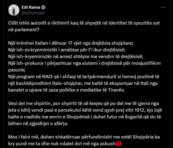 Mos i falni më, duhen shkatërruar përfundimisht me votë! Shqipëria ka kry punë me ta dhe nuk ndalet dot më nga askush”, shkruan Rama. /rtsh.al/