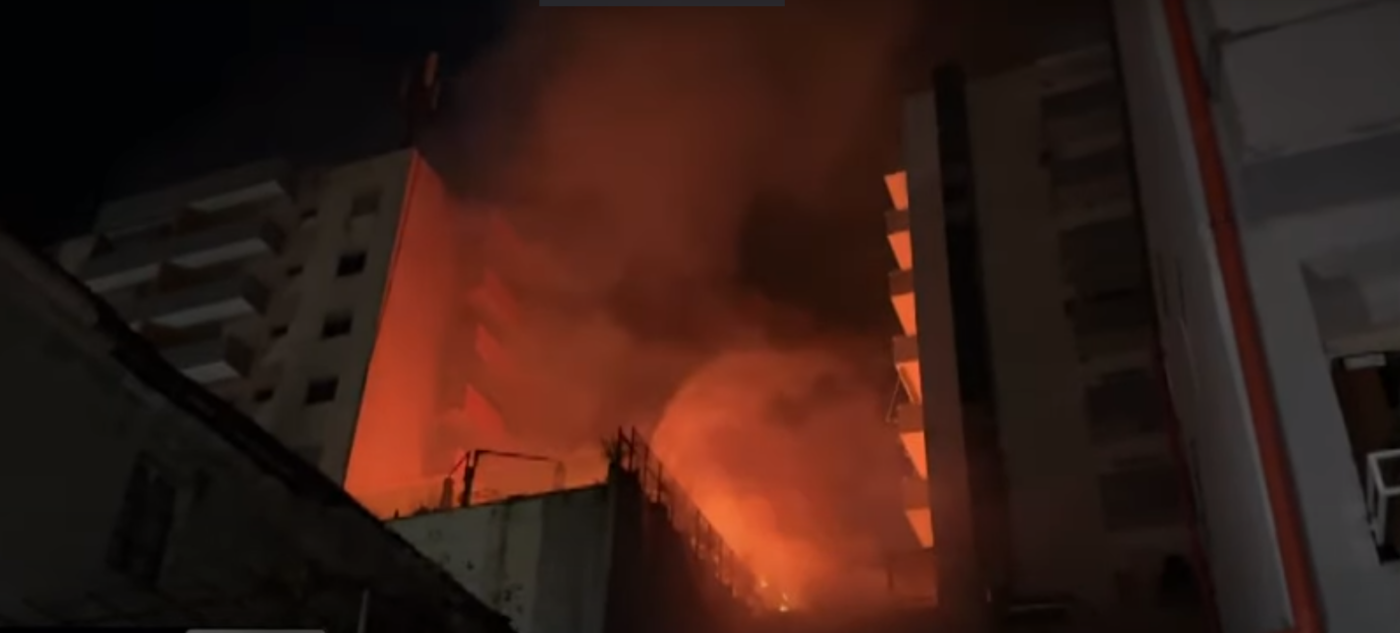 Qielli është kthyer në ngjyrë të kuqe nga flakët që janë riaktivizuar në godinën në Lushnjë.