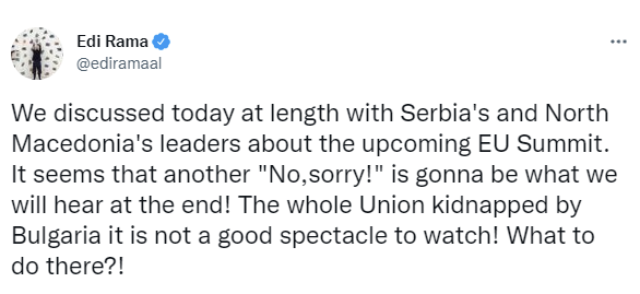 “Ne diskutuam gjatë sot me liderët e Serbisë dhe Maqedonisë së Veriut për Samitin e ardhshëm të BE-së. Duket se një tjetër “Jo, më fal!” do të jetë ajo që do të dëgjojmë në fund! I gjithë Unioni i rrëmbyer nga Bullgaria nuk është një spektakël i mirë për t’u parë! Çfarë duhet bërë atje?”, ka shkruar Rama. /arbresh.info/