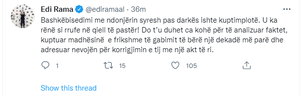 “Disa prej të ftuarve mbrëmë nuk erdhën në darkën e organizuar nga misioni ynë në Strasburg, megjithëse e kishin konfirmuar më parë! Nuk ndjehemi mirë pas fjalimit, ishte arsyeja. E mirëkuptueshme. S’ke si ndjehesh mirë kur dëgjon një histori horrori si sajesa e trafikut të organeve! Bashkëbisedimi me ndonjërin syresh pas darkës ishte kuptimplotë. U ka rënë si rrufe në qiell të pastër. Do t’u duhet ca kohë për të analizuar faktet, kuptuar madhësinë e frikshme të gabimit të bërë një dekadë më parë dhe adresuar nevojën për korrigjimin e tij me një akt të ri. Por është e neveritshme, që edhe për një padrejtësi kaq ekstreme dhe për një të drejtë kombëtare kaq legjitime, e kaq përtej politikës së ditës, e djathta jonë e nongratave dhe e rublave, gjen kurajon të kundërvihet e të merret me dokrra!#NjerëzPaAtdhe #KatranMeMeBojë”, ka shkruar Rama./arbresh.info/