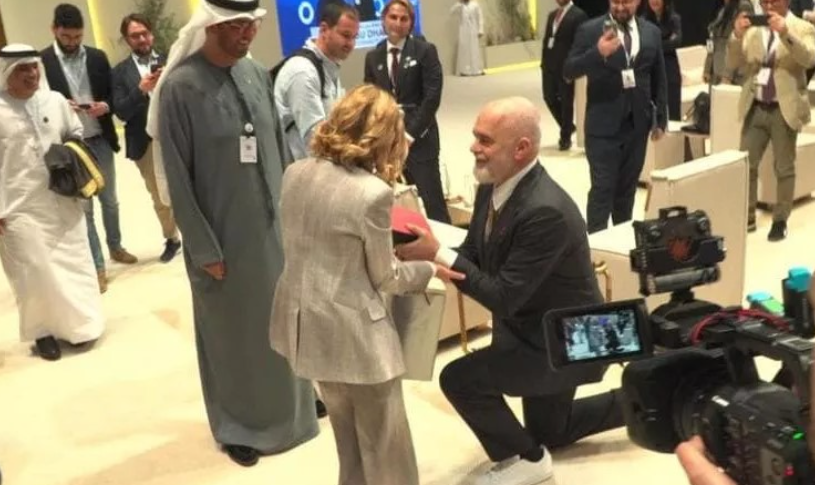 Në videon e publikuar nga mediat italiane, kryeministri Rama shihet teksa e pret Melonin në pavijonet e Qendrës Kombëtare të Ekspozitave në Abu Dhabi dhe teksa ajo mbërrin i drejtohet “Madhëria juaj” dhe i këndon një version të improvizuar të këngës “Tanti Auguri”.