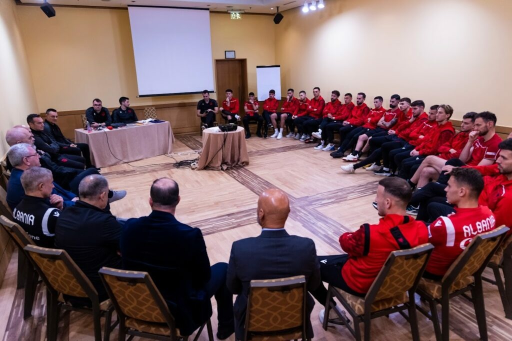 Fjalën e mori i pari Presidenti Duka, i cili i bëri thirrje skuadrës që ta shohë duelin me Moldavinë si finale dhe të mos bëjë llogari për të marrë një pikë.