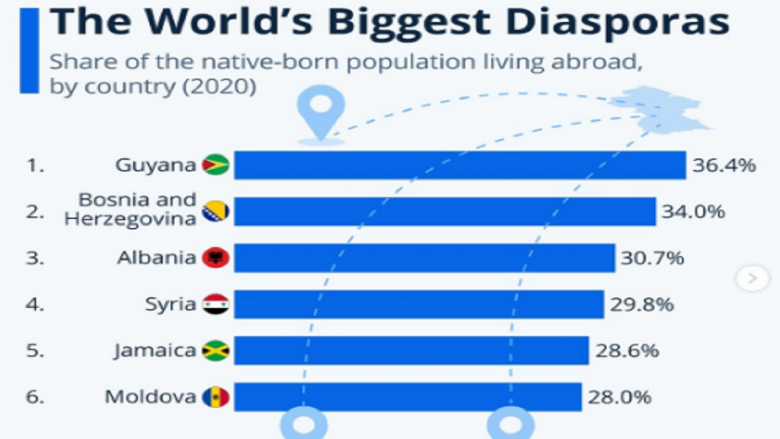 Shqipëria mban vendin e tretë në këtë listë, ku 30.7 përqind e popullsisë jeton në diasporë.