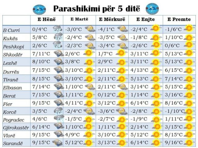 Gjatë ditës së martë e deri ditë e premte vendi ynë do të jetë nën ndikim të kushteve atmosferike të qendrueshem. Orët me diell do të mbizotërojnë në pjesën më të madhe të territorit, vranësira pritet të jenë pakta kryesisht përgjatë relieveve malore.