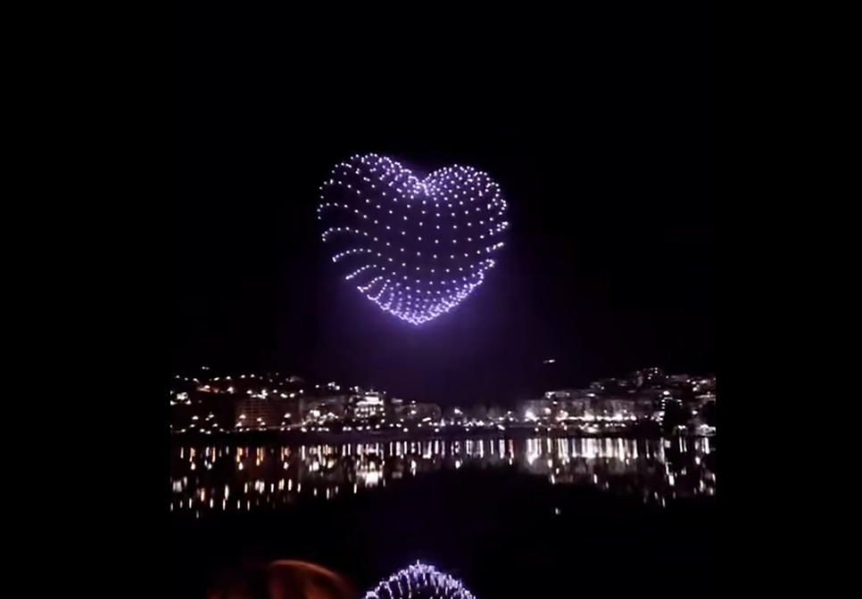Fillimisht me anë të disa dronëve u krijua një zemër, më pas harta e Shqipërisë dhe një “faleminderit Shqipëri”.