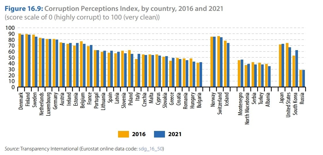 Indeksi i Eurostat bazohet në perceptimin e qytetarëve se sa i korruptuar është sektori i tyre publik, me një rezultat 0, që përfaqëson një nivel shumë të lartë korrupsioni dhe 100 përfaqëson një vlerësim të pastër nga korrupsioni.