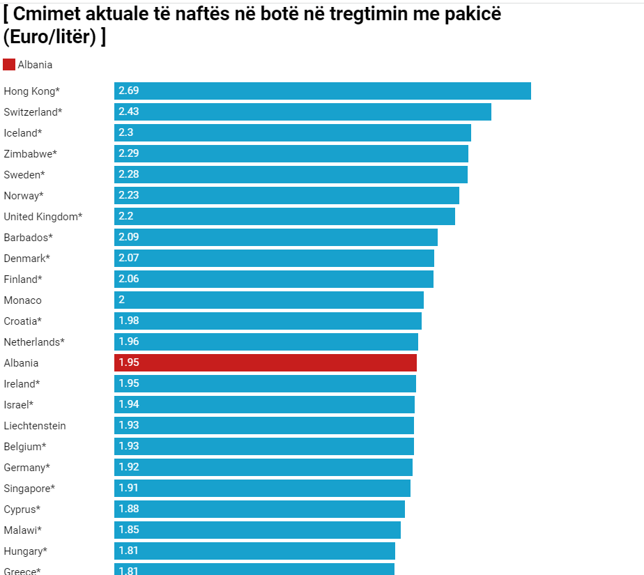 Në raportet e mëparshme të Global Price Shqipëria renditej në mesin e 20 vendeve me çmimin më të lartë të naftës në botë, por së fundmi po shkon drejt majës për çmimet më të larta pasi, ulja e çmimeve në bursa nuk po reflektohet me të njëjtën shpejti si në vendet e tjera.