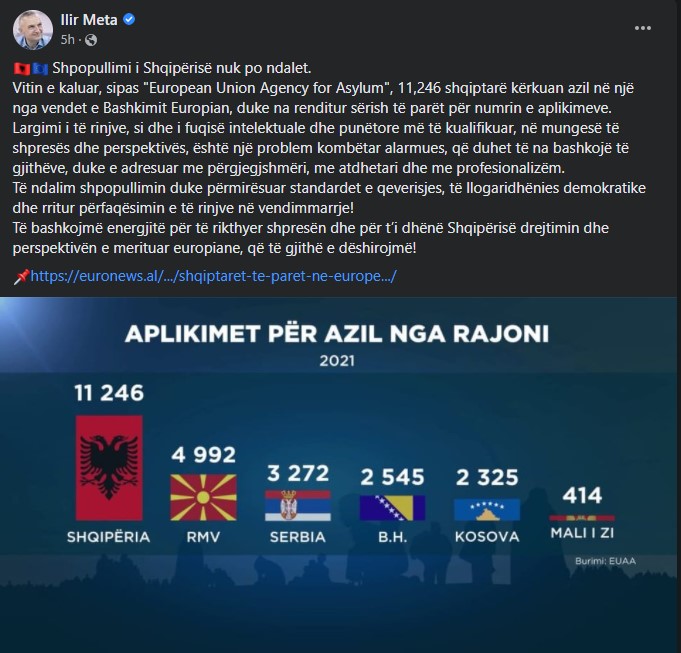 Në një postim në Facebook, Meta ka cituar të dhëna nga Agjencia e BE-së për Azilin që tregojnë se 11,246 shqiptarë kërkuan azil në një nga vendet e BE-së në 2021, duke e renditur Shqipërinë të parën në Ballkanin Perëndimor për numrin e aplikimeve.
