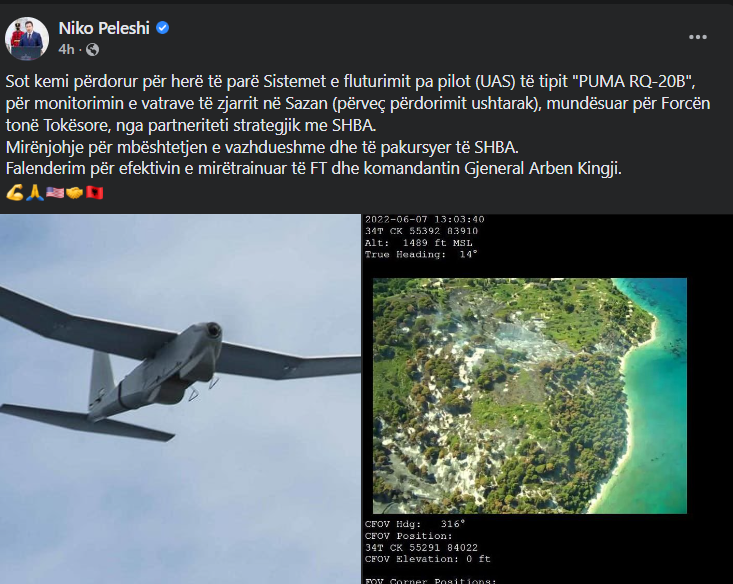 “Sot kemi përdorur për herë të parë Sistemet e fluturimit pa pilot (UAS) të tipit “PUMA RQ-20B”, për monitorimin e vatrave të zjarrit në Sazan (përveç përdorimit ushtarak), mundësuar për Forcën tonë Tokësore, nga partneriteti strategjik me SHBA.
