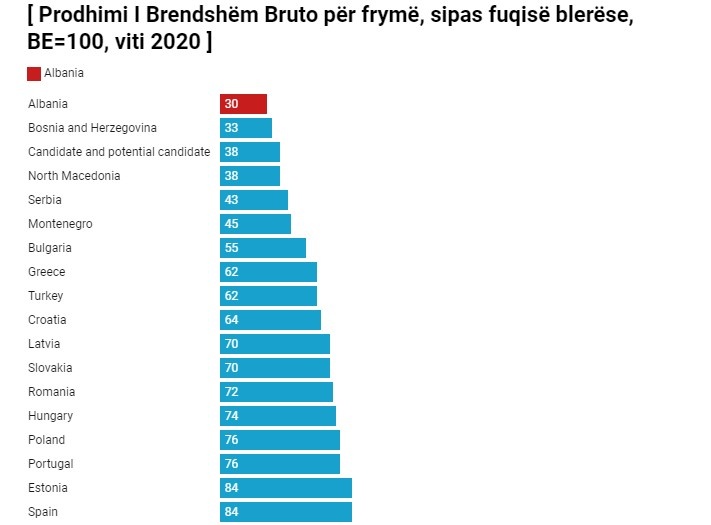 Me 32% të mesatares europiane Shqipëria mbetet e fundit në Europë për të ardhurat për frymë për vitin 2021, sipas të dhënave të fundit të publikuara nga Eurostat (të dhënat nuk përfshijnë Kosovën).