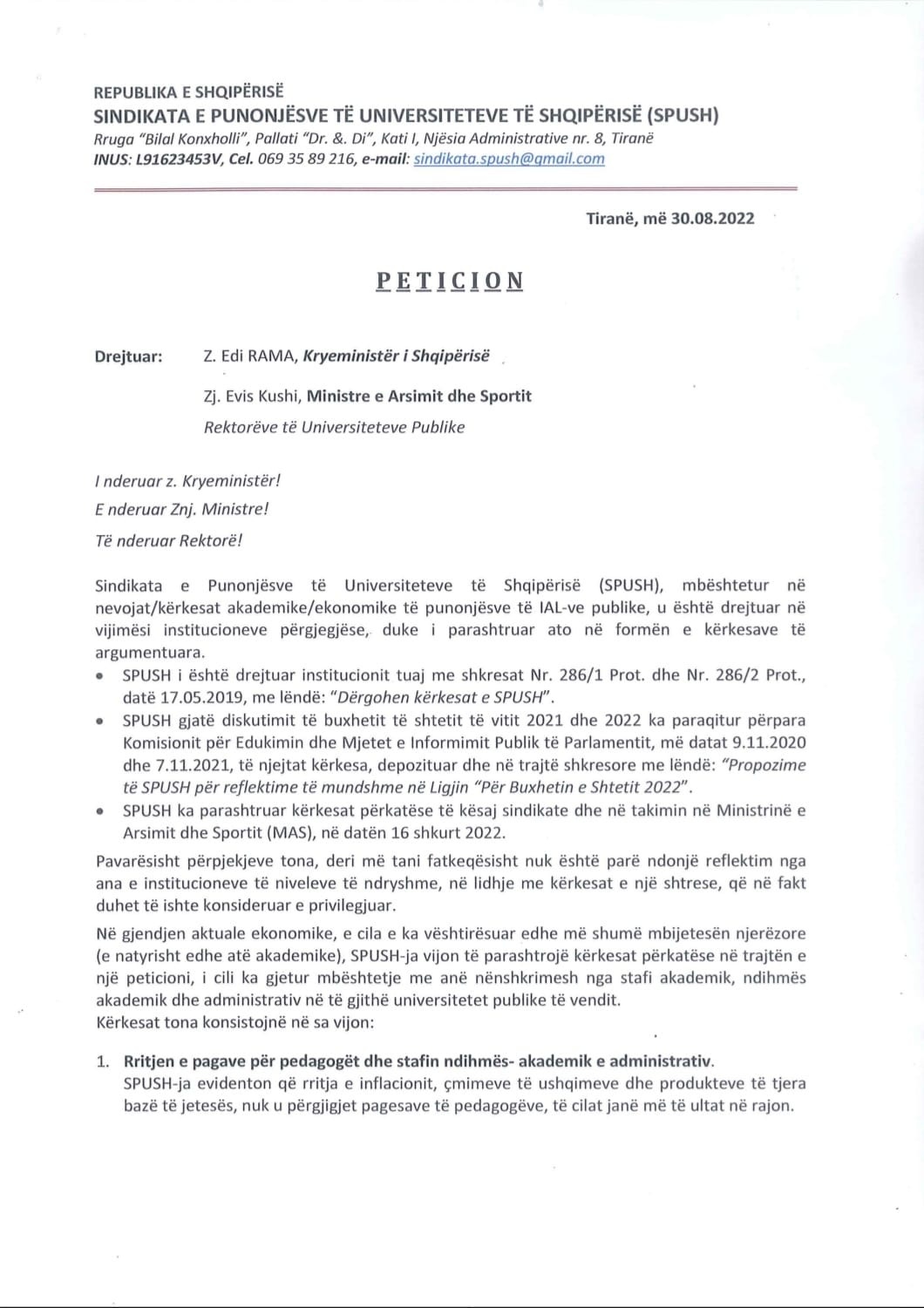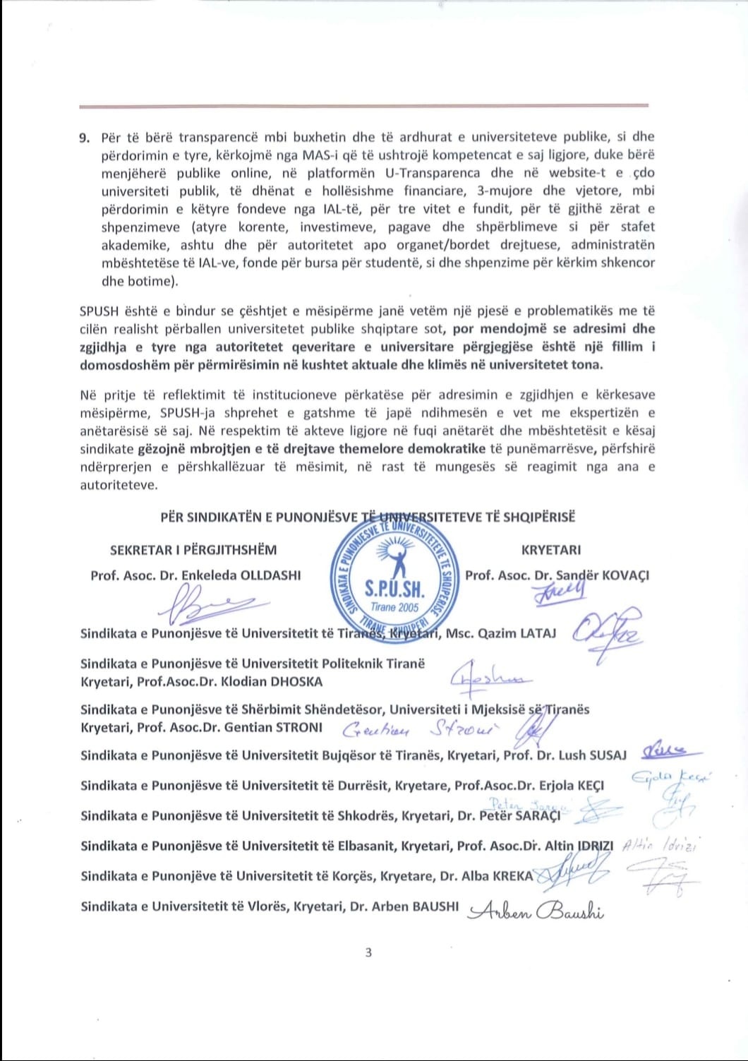 Sindikata e punonjësve të universiteteve të Shqipërisë ka bërë të qartë se kërkesat e tyre janë minimaliste, ndërsa shtoi se rritja e pagave të tyre të bëhet me 30 për qind, për të vijuar me rritje 20 për qind vitin e ardhshëm.