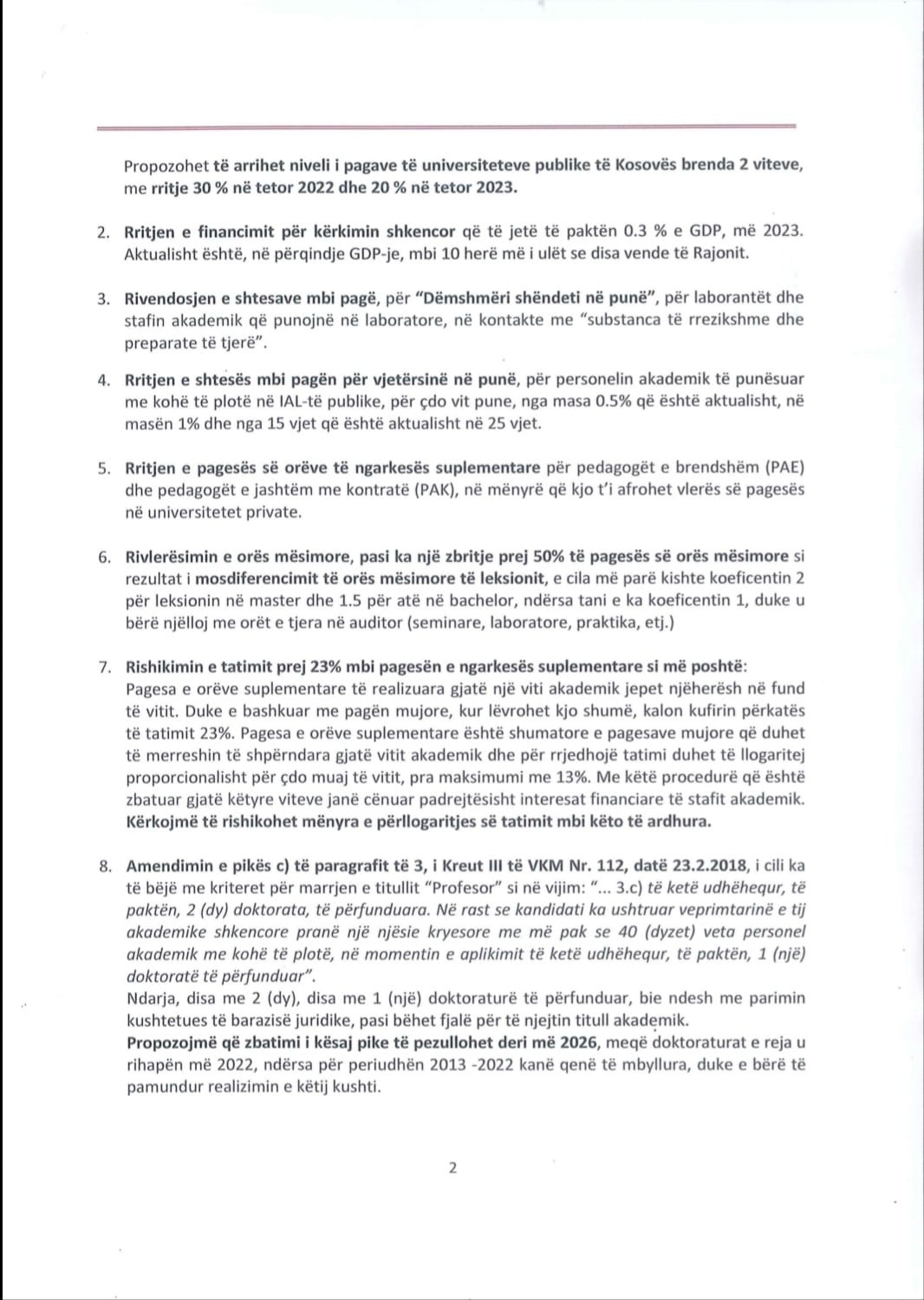 1. Rritja e pagave të pedagogëve dhe stafit ndihmës (kërkojnë që në tetor të këtij viti paga e tyre të rritet me 30 për qind ndërsa në tetor të vitit 2023 të rritet me 20 për qind)