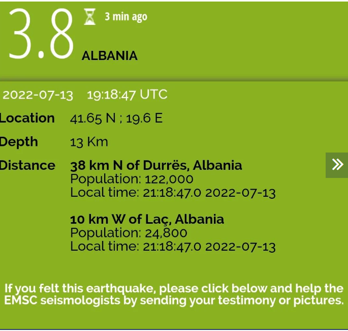 Sipas të dhënave paraprake, tërmeti ka rënë me magnitudë 3.8 të shkallës Rihter, me epiqendër 10 km në perëndim nga qyteti i Laçit, dhe 38 km në veri nga Durrësi.