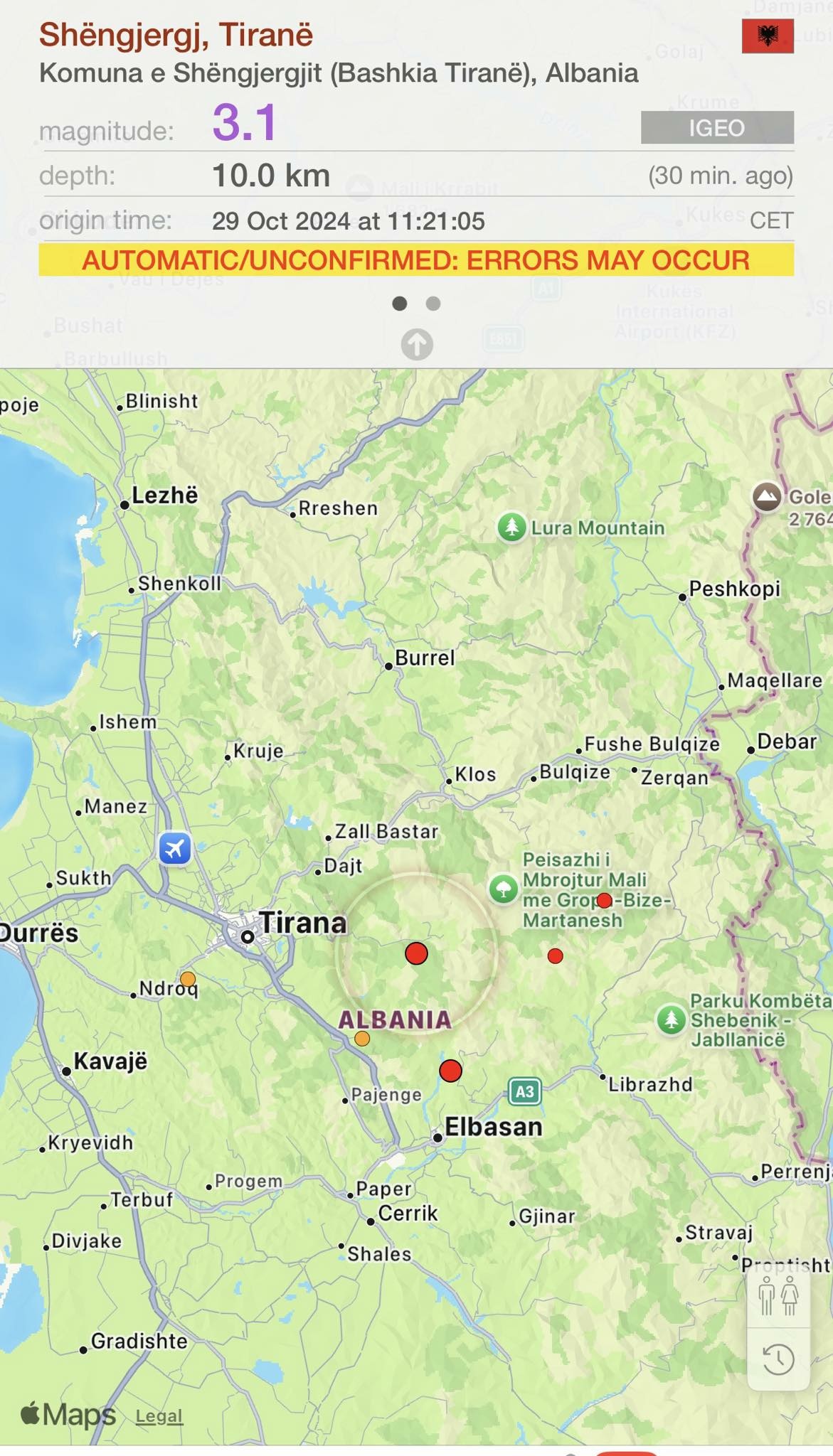Një tërmet me magnitudë 3.1 shkallë është regjistruar në Tiranë .