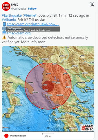 Qendra Sizmologjike Euro-Mesdhetare (EMSC) ka njoftuar se epiqendra ka qenë 10 kilometra në veri-perëndim të Gjirokastrës.