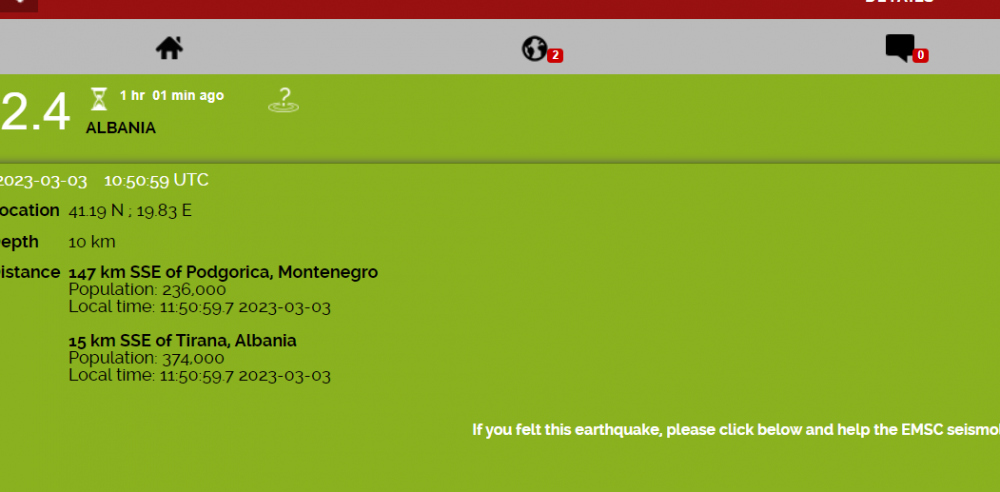 Një tërmet me magnitudë 2.4 ka rënë paraditen e sotme në Tiranë dhe Kavajë.