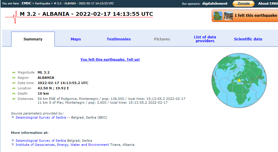 Sipas ueb-faqes që bën regjistrimin në kohë reale të tërmeteve, dridhja e tokës ka ndodhur rreth orës 14:33 të ditës së sotme.