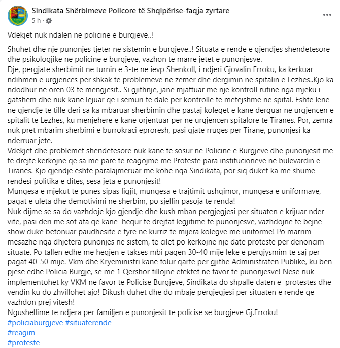 Pas ngjarjes ka reaguar sot Sindikata e Shërbimeve Policore të Shqipërisë.