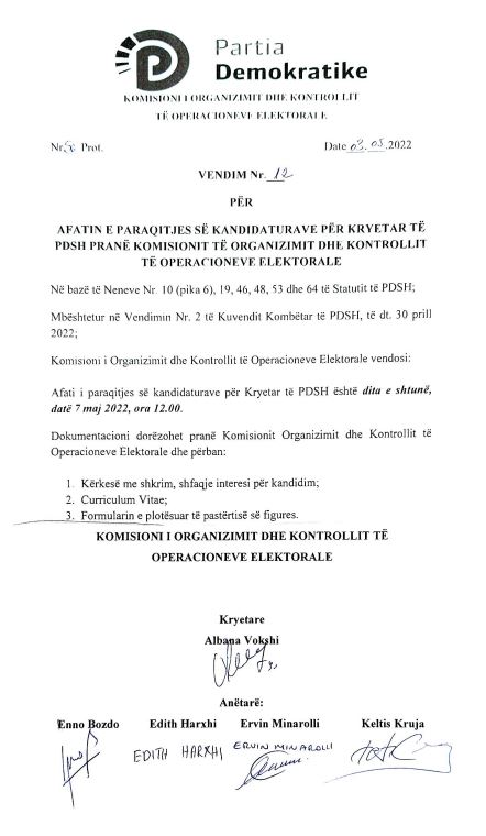 Kujtojmë se zgjedhjet për kreun e PD, me vendim të Kuvendit Kombëtar të 30 prillit do të mbahen në 22 maj. Deri më tani i vetmi që e ka pranuar publikisht që do të garojë për kreun e ri të PD-së është Sali Berisha.