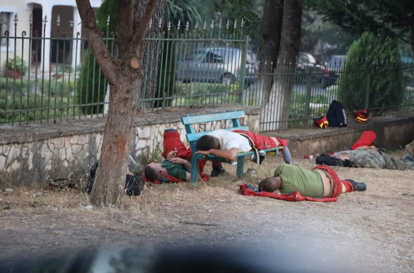 Sikurse duket edhe në foton e mësipërme, të rraskapitur pas zjarrit apokaliptik në Delvinë, zjarrfikësit janë shtrirë për të pushuar në stole e në tokë. /Tch
