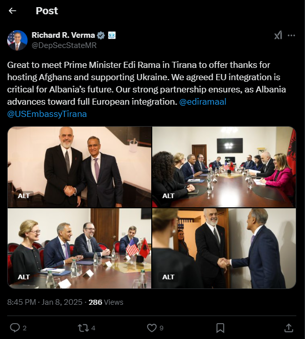 Verma me anë të një postimi në platformën X ka falënderuar Ramën për pritjen e afganëve dhe mbështetjen ndaj Ukrainës ndërsa shton se mbështesin integrimin e Shqipërisë drejt BE-së.
