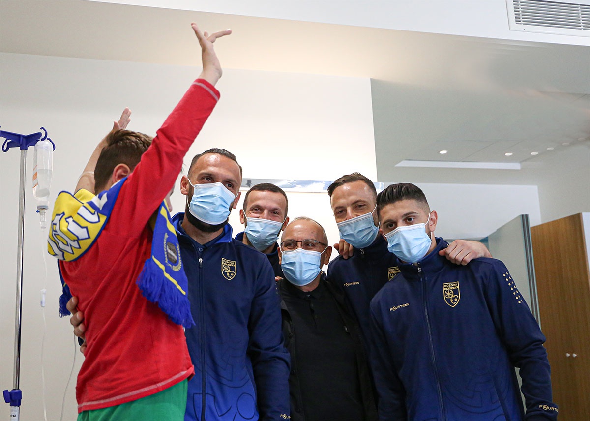 Me këtë rast, sot, presidenti Agim Ademi, në shoqëri të drejtorit të Kombëtares, Muharrem Sahiti dhe futbollistëve Samir Ujkani, Vedat Muriqi, Amir Rrahmani e Milot Rashica si dhe kreut të grupit të tifozëve “Dardanët”, Lulzim Berisha, e kanë vizituar Klinikën e Pediatrisë në Prishtinë, me ç‘rast kanë bërë shpërndarjen e fanellave, topave dhe shalleve të kombëtares për fëmijët që janë të shtrirë në këtë klinikë për mjekim.