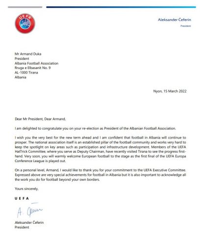 Jam i lumtur t’ju uroj për rizgjedhjen tuaj si President i Federatës Shqiptare të Futbollit. Ju uroj më të mirat në këtë mandat të ri dhe jam besimplotë se futbolli në Shqipëri do të vazhdojë të zhvillohet. Vetë Federata Shqiptare e Futbollit është shtylla kryesore e komunitetit të futbollit dhe punon shumë për të mbajtur në qendër të vëmendjes çështje kyçe si pjesëmarrja në evenimente të rëndësishme apo zhvillimi i infrastrukturës. Anëtarë të Komitetit HatTrick të UEFA-s, ku ju jeni edhe Zëvendës-Kryetar kanë vizituar së fundmi Shqipërinë për të parë nga afër progresin. Shumë shpejt, ju do të mirëprisni me ngrohtësi në skenë edhe futbollin europian, teksa do të luhet finalja e parë e UEFA Europa Conference League.