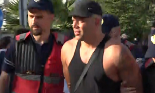 Policia shqiptarë, i ka vendosur menjëherë prangat dy tifozëve dhe i ka shoqëruar drejt stacionit policor./arbresh.info/
