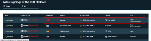 Muriqi do të jetë i huazuar tek Mallorca deri në fund të sezonit me mundësi blerje.