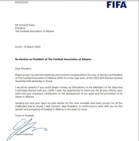 Më poshtë edhe letra e plotë e Presidentit të FIFA-s, Gianni Infantino drejtuar Presidentit të FSHF-së, Armand Duka:
