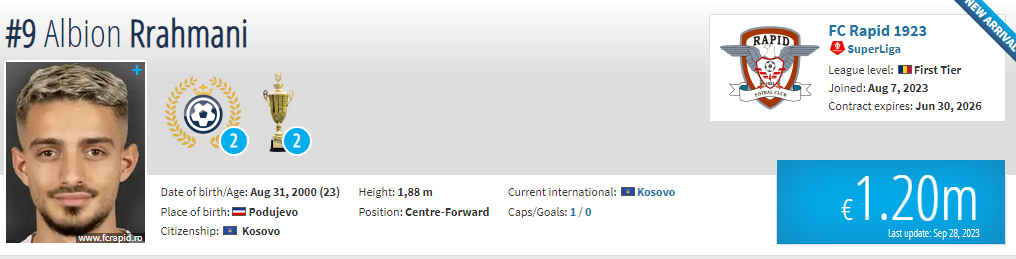Sulmuesi i kombëtares së Kosovës dhe Rapidit të Bukureshtit, Albion Rrahmani i është rritur vlera.