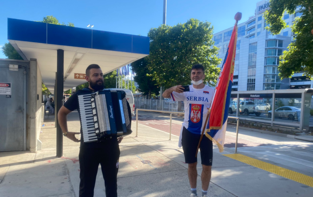 Serbët të cilët jetojnë në Australi, kanë shkuar në oborrin e hotelit se ku është i ngujuar teniseri, Novak Djokovic, i cili ende nuk është bërë e ditur se a do të mund të qëndrojë në Australi apo jo.