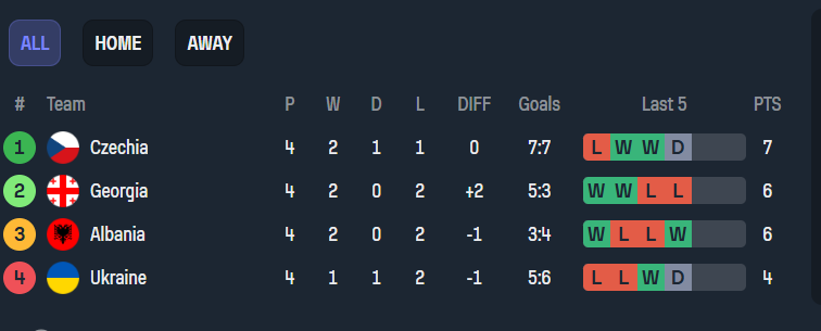 Aktualisht në tabelën e grupit 1 të Ligës B të Kombeve prinë Çekia me shtatë pikë, Gjeorgjia dhe Shqipëria kanë nga gjashtë kurse e fundit është Ukraina me katër sosh./Arbresh.info/DrilonHalili/